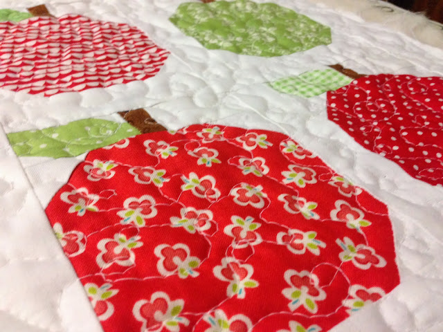 Her instructions are great and it came together really easy. A few days later I was quilting it and putting the binding on. It took me three days to finally decide on the binding. I always thought I would bind it in red polka-dot fabric. But after much thought I went with the green check binding and red dot fabric on the back. And it is perfect. The green is just the right balance.
